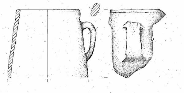 Orlo appiattito e parete a profilo rettilineo. A breve distanza dall'orlo si è conservata un'ansa nastriforme con profilo ad orecchio.