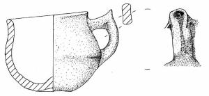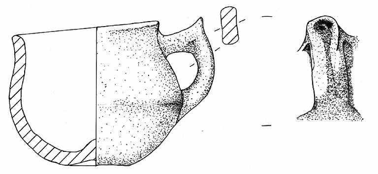 Orlo arrotondato, labbro leggermente esoverso, parete a profilo sinuoso e fondo ombelicato. A breve distanza dall'orlo è impostata un'ansa nastriforme con profilo a gomito e breve appendice asciforme.