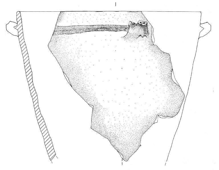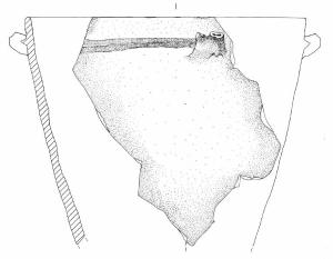 Orlo arrotondato e parete a rofilo rettilineo. A breve distanza dall'orlo è impostato un cordone orizzontale a sezione triangolare su cui si trova una decorazione plastica verticale con due appendici a bottone.