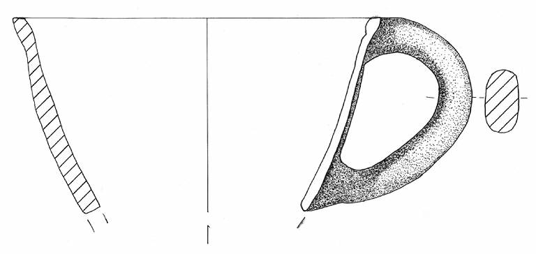 Orlo appiattito, labbro leggermente esoverso e parete a profilo leggermente convesso. All'altezza dell'orlo è impostata un'ansa nastriforme con profilo ad orecchio.