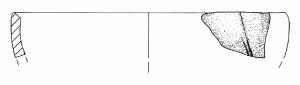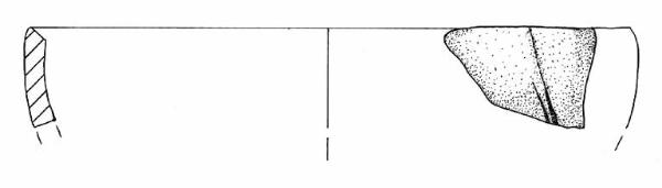 Orlo appiattito, obliquo verso l'interno e parete a profilo convesso. La parete appare decorata da due solcature verticali e leggermente oblique.