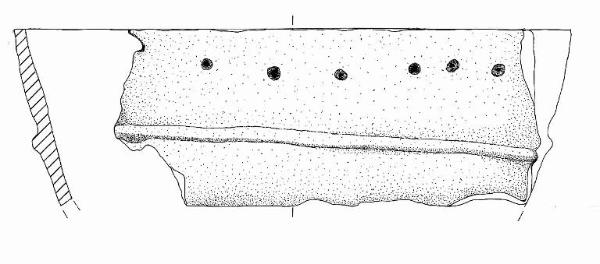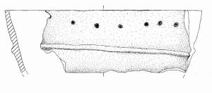 Orlo appiattito, multiforato e parete a profilo convesso. A breve distanza dall'orlo è impostato un cordone orizzontale.