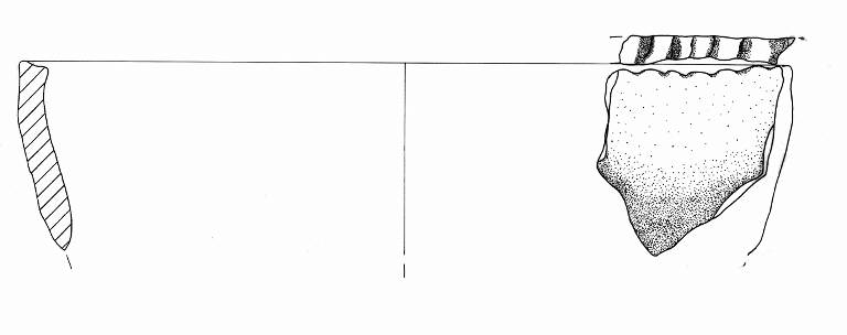 Orlo appiattito, obliquo verso l'interno, decorato con tacche e parete a profilo rettilineo.
