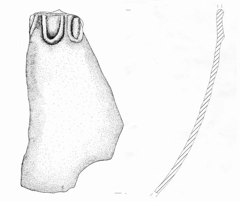 Parete a profilo convesso su cui è impostata una decorazione costituita da un cordone orizzontale da cui scendono altri cordoni plastici che formano un motivo a festone.