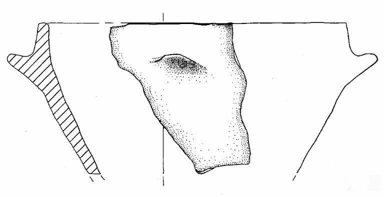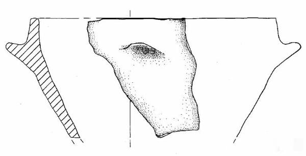 Orlo arrotondato e parete a profilo convesso. A breve distanza dall'orlo è impostata una presa a linguetta di forma semicircolare e rivolta verso l'alto.