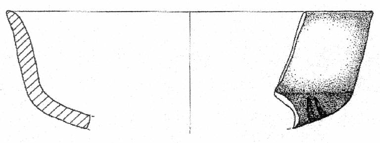 Orlo arrotondato, debolmente esoverso, corpo carenato con vasca mediamente profonda, decorata esternamente da due solcature curvilinee, parete rettilinea esoversa. Superficie di colore grigio molto scuro (5 Y 3/1).