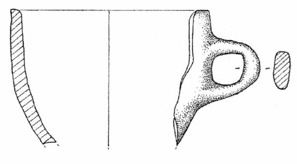 Orlo arrotondato, corpo a profilo convesso, fondo assente. Ansa ad anello, sezione nastriforme, impostata sotto l'orlo. Superficie di colore grigio (10 YR 6/1).