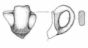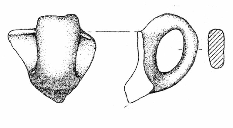 Orlo, arrotondato, e parete con ansa a nastro verticale, leggermente sopraelevata, ad anello. Superficie di colore grigio (10 YR 5/1).