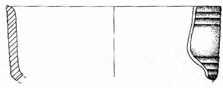 Orlo arrotondato, corpo carenato con parete rettilinea, verticale, decorata da due fasci di tre solcature orizzontali e parallele posti uno sotto l'orlo e l'altro sopra carena. Superficie di colore grigio molto scuro (5 Y 3/1).