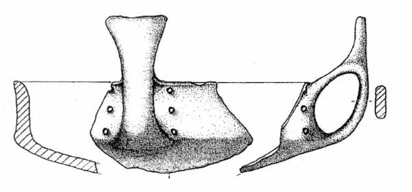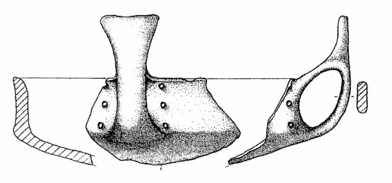 Orlo assottigliato, corpo carenato con vasca bassa e parete rettilinea verticale, ansa ad ascia impostata sull'orlo e sul diametro massimo. Si notano sei fori passanti disposti verticalmente lungo parete, tre da un lato e tre dall'alto dell'ansa. Superficie di colore grigio molto scuro (5 Y 3/1).