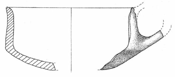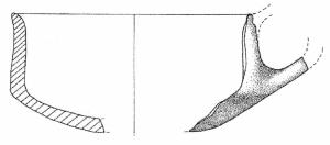 Orlo assottigliato, leggermente esoverso corpo carenato con vasca bassa e parete rettilinea verticale. Si conservano agli attacchi dell'ansa impostati sull'orlo e sul diametro massimo. Superficie di colore grigio molto scuro (5 Y 3/1).