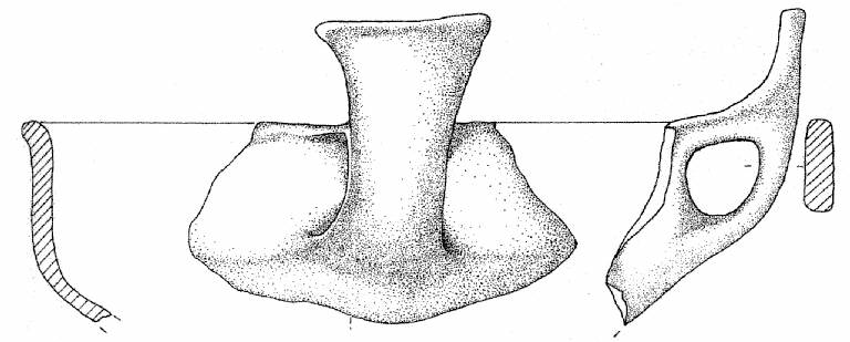Orlo arrotondato, esoverso, corpo carenato con vasca bassa e parete rettilinea a profilo verticale, ansa ad ascia impostata sull'orlo e sul diametro massimo. Superficie di colore grigio scuro (7,5 R 4/0).