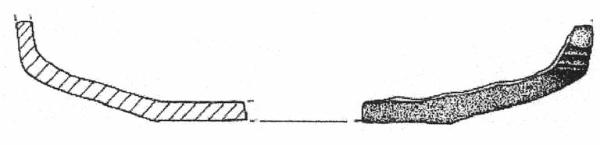 Fondo con frammento di parete decorata da solcature orizzontali e parallele. Superficie di colore grigio molto scuro (5 Y 3/1).