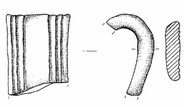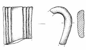 A nastro verticale, decorata da due fasci di tre solcature verticali lungo i margini. Superficie di colore grigio scuro (2,5 Y 4/0).