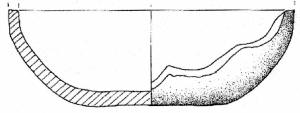 Fondo piatto a spigolo arrotondato, parete convessa con accenno di carena. Superficie di colore grigio molto scuro (5 Y 3/1).