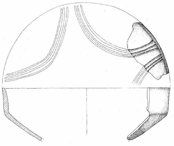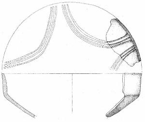Orlo arrotondato, corpo carenato con parete rettilinea debolmente esoversa, e vasca profonda, decorata da due fasci di tre solcature curvilinee, che delineavano forse un motivo a festone. Superficie di colore grigio chiaro (2,5 Y 7/2).