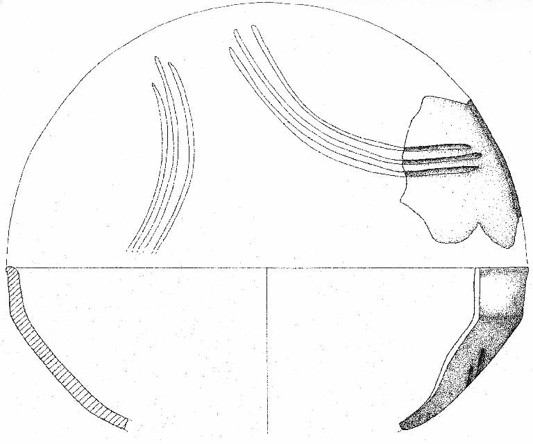 Orlo arrotondato, corpo carenato con parete rettilinea leggermente esoversa, e vasca profonda decorata da un fascio di tre solcature curvilinee che delineavano forse un motivo festone. Superficie di colore grigio molto scuro (5 Y 3/1).