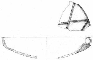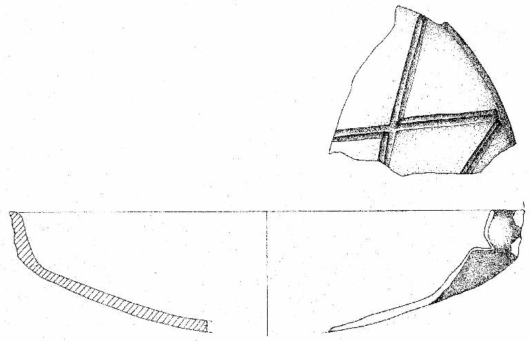 Orlo assottigliato, corpo carenato con parete bassa rettilinea, debolmente esoversa e vasca profonda. Si conservano gli attacchi dell'ansa impostate sull'orlo e sulla carena. La vasca è decorata da motivo cruciforme prodotto da fasci di due solcature che si intersecano. Superficie di colore grigio molto scuro (5 Y 3/1).