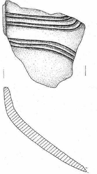 Orlo arrotondato, parete rettilinea leggermente esoversa, e vasca profonda decorata due fasci di tre solcature curvilinee, che delineavano forse un motivo festone. Superficie di colore grigio chiaro (2,5 Y 7/2).