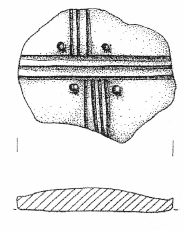 Fondo piatto, decorato esternamente da un motivo cruciforme composto da tre fasci di tre solcature rettilinea alternati a piccole coppelle. Superficie di colore grigio molto scuro (5 Y 3/1).