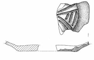 Fondo piatto, decorato esternamente da due fasci di due solcature oblique, brevi e sottili, unite da tre solcature curvilinee. Superficie di colore grigio molto scuro (5 Y 3/1).
