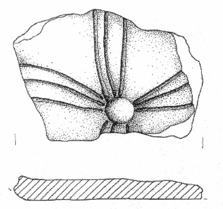 Fondo piatto decorato esternamente con un motivo cruciforme composto da fasci di tre solcature partenti da una coppella centrale. Superficie di colore grigio (10 YR 6/1).