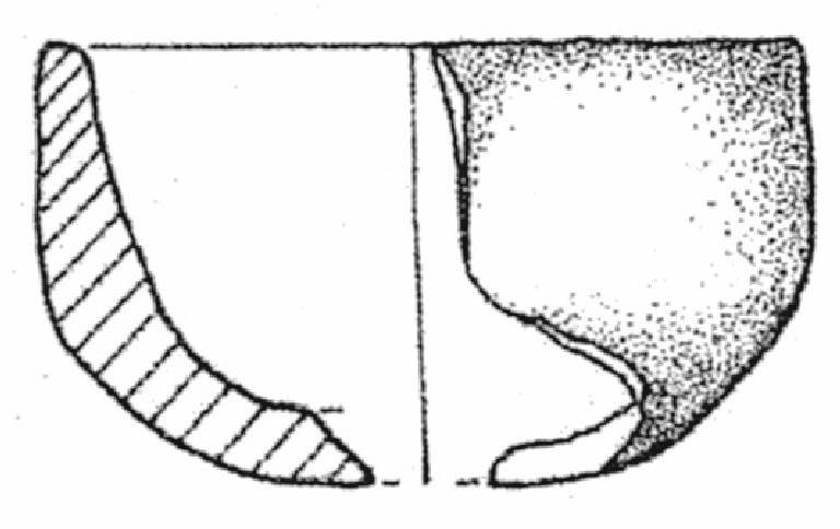 Orlo arrotondato, corpo a calotta con parete convessa. Superficie di colore grigio (5 Y 5/1).