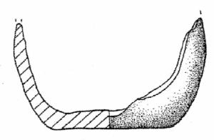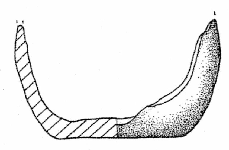 Fondo piatto a spigolo arrotondato con frammento di parete a profilo complesso. Superficie di colore grigio molto scuro (5 Y 3/1).