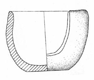 Orlo assottigliato, corpo troncoconico a profilo convesso, fondo piatto. Superficie di colore grigio scuro (7,5 R 4/0).