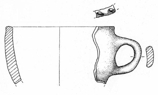 Orlo piatto, a tacche, parete convessa. Ansa a nastro verticale, conformata ad anello, impostata dieci mm al di sotto dell'orlo. Superficie di colore grigio (10 YR 5/1).