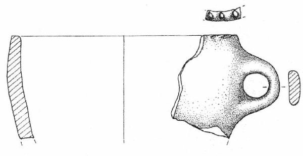 Orlo a tacche, parete convessa, anse a nastro verticale, ad anello, impostata a dieci mm sotto l'orlo. Superficie di colore grigio scuro (2,5 Y 4/0).