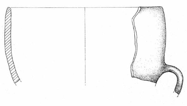Orlo arrotondato, parete convessa con frammento di ansa, impostata settantacinque mm sotto l'orlo. Superficie di colore grigio scuro (2,5 Y 4/0).