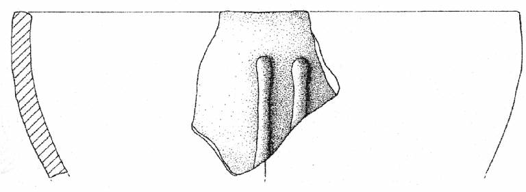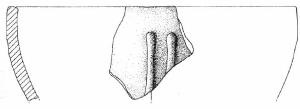 Orlo arrotondato, parete convessa decorata da due cordoni verticali applicati a venti mm sotto l'orlo. Superficie di colore grigio (2,5 Y 5/0).