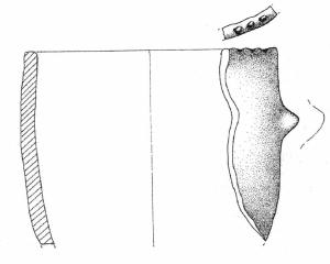 Orlo a tacche, parete debolmente convessa con serie di prese a linguetta orizzontali, distanziate fra loro, impostate a trentacinque mm sotto l'orlo. Superficie di colore grigio rosa (5 YR 6/2).