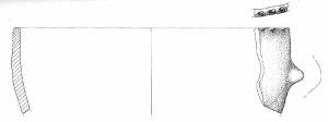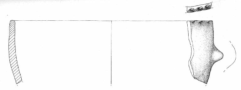 Orlo a tacche, parete convessa con presa linguetta orizzontali, impostata a quaranta mm sotto l'orlo. Superficie di colore grigio (10 YR 5/1).