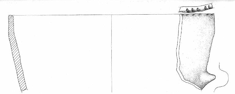 Orlo a tacche, parete convessa con presa a linguetta orizzontale, impostata a cento mm sotto l'orlo. Superficie di colore bruno scuro (7,5 YR 3/2).