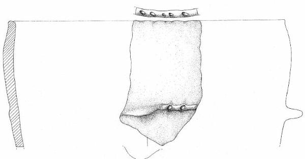 Orlo a tacche, debolmente esoverso, parete convessa con cordone a tacche orizzontale e presa a linguetta orizzontale, impostati a centoquattordici mm sotto l'orlo. Superficie di colore bruno grigio (10 YR 5/2).