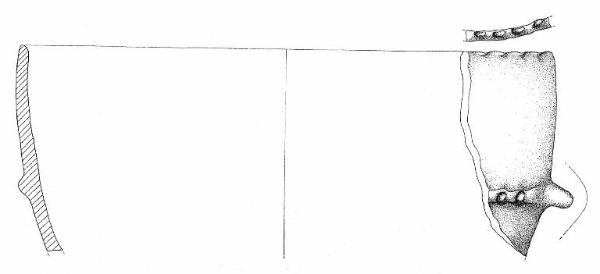 Orlo a tacche, parete convessa con cordone a tacche orizzontali e presa a linguetta orizzontale, impostati a ottantasei mm sotto l'orlo. Superficie di colore grigio (10 YR 6/1).