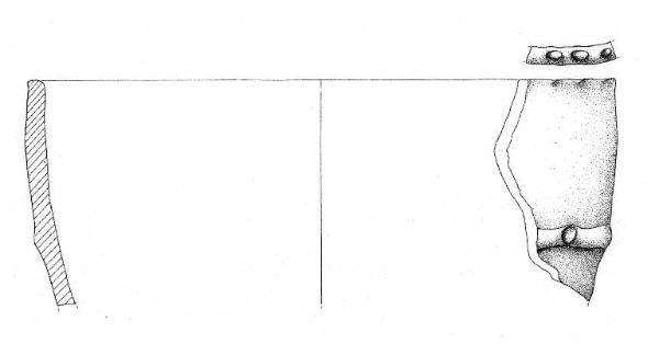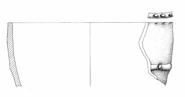 Orlo a tacche, parete convessa come cordone a tacche orizzontali, impostato a ottantacinque mm sotto l'orlo. Superficie di colore bruno scuro (7,5 YR 3/2).
