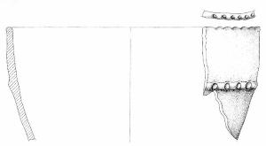 Orlo a tacche, leggermente esoverso, parete convessa come cordone a tacche orizzontali, impostata 7sei mm sotto l'orlo. Superficie di colore grigio rosa (7,5 YR 6/1).
