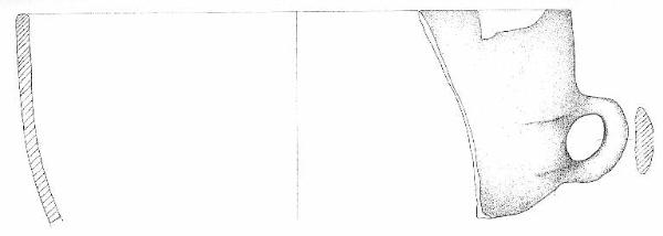 Orlo piatto, parete convessa con grossa ansa a nastro verticale, ad anello, impostata a sessanta mm sotto l'orlo. Superficie di colore grigio scuro (2,5 Y 4/0).