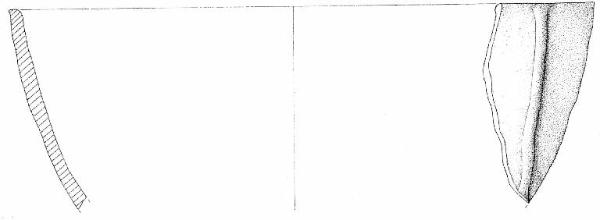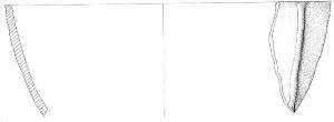 Orlo piatto, parete convessa con un cordone liscio, verticale applicato dall'orlo per tutta la parete. Superficie di colore grigio (5 Y 5/1).