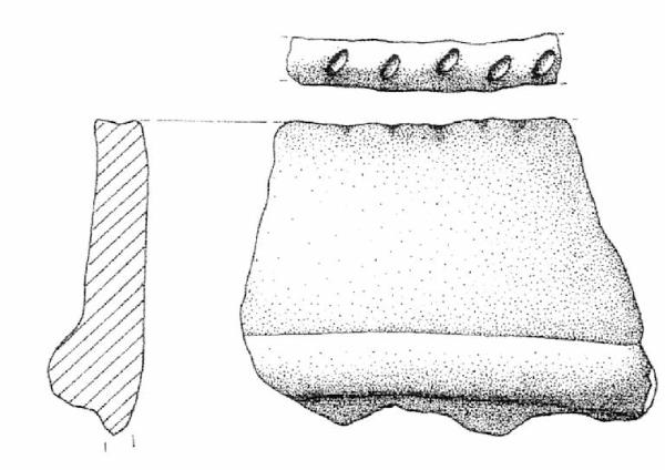 Orlo a tacche e parete decorata da un cordone liscio, orizzontale, impostato a quarantanove mm sotto l'orlo. Superficie di colore grigio (10 YR 6/1).