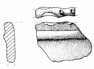 Orlo a tacche, parete con un cordone liscio, orizzontali, impostato 8 mm sotto l'orlo. Superficie di colore bruno scuro (7,5 YR 3/2).