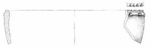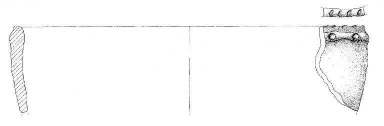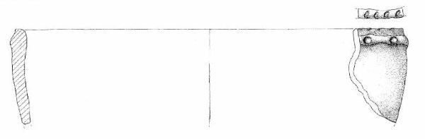 Orlo piatto, a tacche, parete rettilinea con cordone a tacche, orizzontale, impostato a sei mm sotto l'orlo. Superficie di colore grigio (7,5 R 7/0).