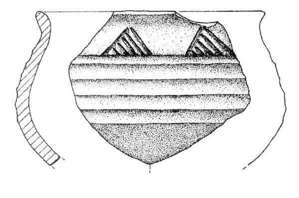 Orlo arrotondato esoverso, corpo a profilo biconico globooso decorato da una serie di triangoli tratteggiati e da solcature orizzontali e parallele Superficie di colore grigio molto scuro (5 Y 3/1).