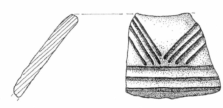 Orlo piatto e pareti rettilinea, decorata da sottili solcature oblique che delineano un motivo a triangoli, al di sotto del quale è presente un fascio di tre solcature orizzontali e parallele. Superficie di colore grigio (10 YR 5/1).