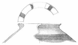 Orlo a breve tesa, ingrossato ed esoverso, parete rettilinea decorata da un fascio di sette ampia solcature orizzontali e parallele, impostato a ottantotto mm sotto l'orlo. Sull'orlo sono presenti tre serie, equidistanti, di tre brevi solcature. Superficie di colore giallo rosso, grigio (7,5 YR 6/8, 10 YR 6/1).