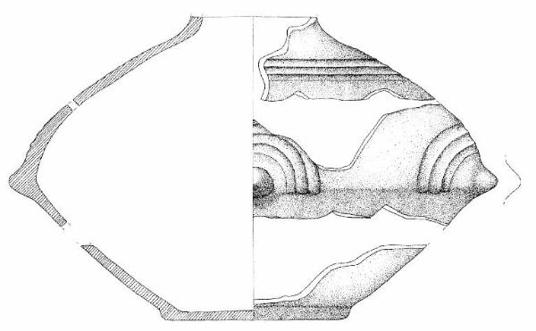 Orlo assente, parete debolmente convessa, fondo piatto con breve attacco. Lungo la massima espansione del vaso sono presenti bugne mammelliformi, equidistanti, sormontate da tre solcature concentriche ad arco di cerchio. La fascia mediana della parete è decorata da tre larghe solcature orizzontali e parallele. Superficie di colore bruno molto pallido, grigio chiaro (10 YR 7/3, 2,5 Y 7/0).