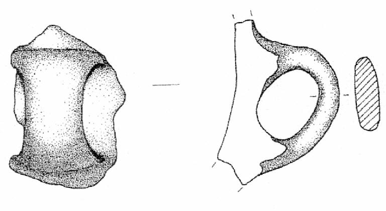 Ansa a nastro verticale, non sopraelevata, ad orecchio. Superficie di colore grigio rosa (5 YR 6/2).
